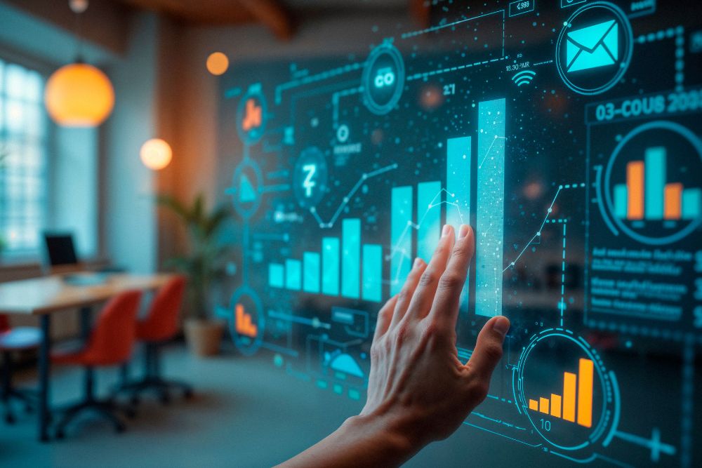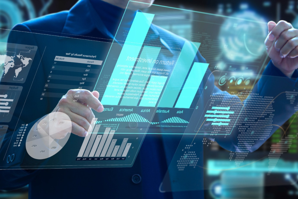 A person analyzing digital data dashboards with charts, graphs, and analytics visualizations representing Artificial Intelligence, Machine Learning, and Big Data concepts.